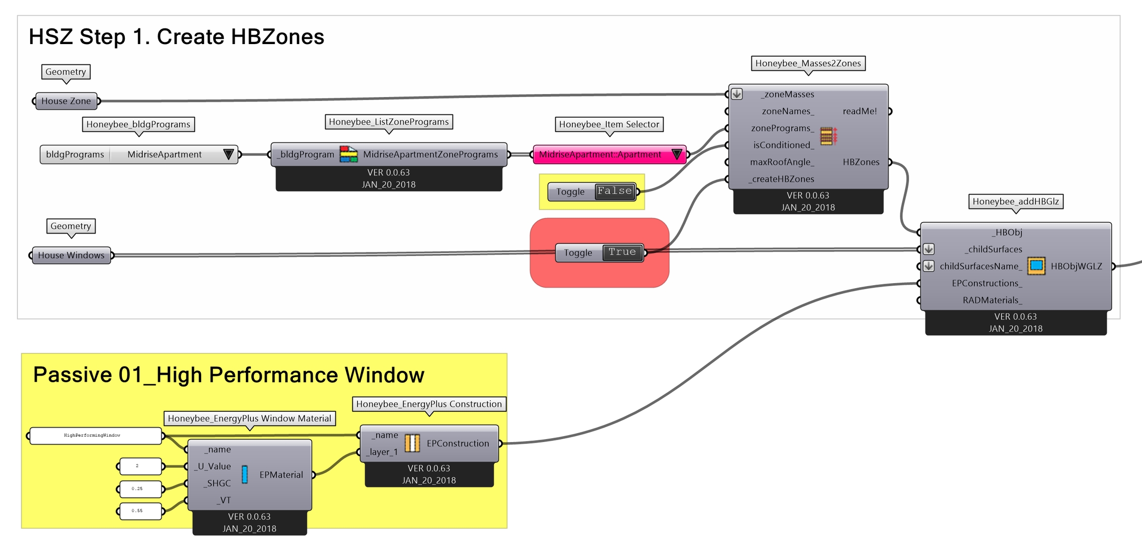 1.02 Zooming in, you can see that we will create a construction for a high performance window, and connect it to the Honeybee_addHBGlz component. This will replace the default assumption about glazing with our specifications for a high-performance window.