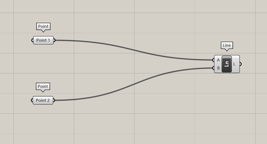 ii.13 Grasshopper ejecuta todas las operaciones de izquierda a derecha. El lado izquierdo de los componentes recibe los datos de entrada, mientras que en el lado derecho se arrojan los resultados. Conecta los datos de salida del componente 'Start Point' a los datos de entrada del componente de lÃnea marcado como 'A'. Esto se realiza al hacer clic izquierdo y arrastrando desde un punto de conexión hasta el siguiente. La conexión puede hacerse en cualquier sentido entre dos puntos cualquiera (el cómputo siempre se ejecutará de izquierda a derecha).