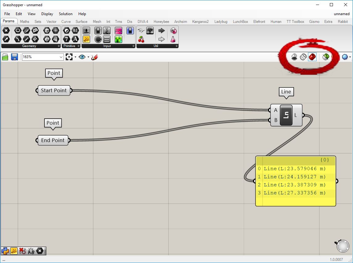 ii.15 Una lÃnea roja debe ahora aparecer entre los dos puntos en Rhino. Esta es solamente una pre-visualización y no será posible seleccionar esta lÃnea en Rhino. Es importante hacer notar que esta lÃnea no ha sido guardada en Rhino y ésta desaparecerÃa cuando Grasshopper fuese cerrado. Este comportamiento ocurre para mantener a Grasshopper corriendo de manera ágil; si toda la geometrÃa generada se guardara inmediatamente en Rhino el programa correrÃa muy lentamente.